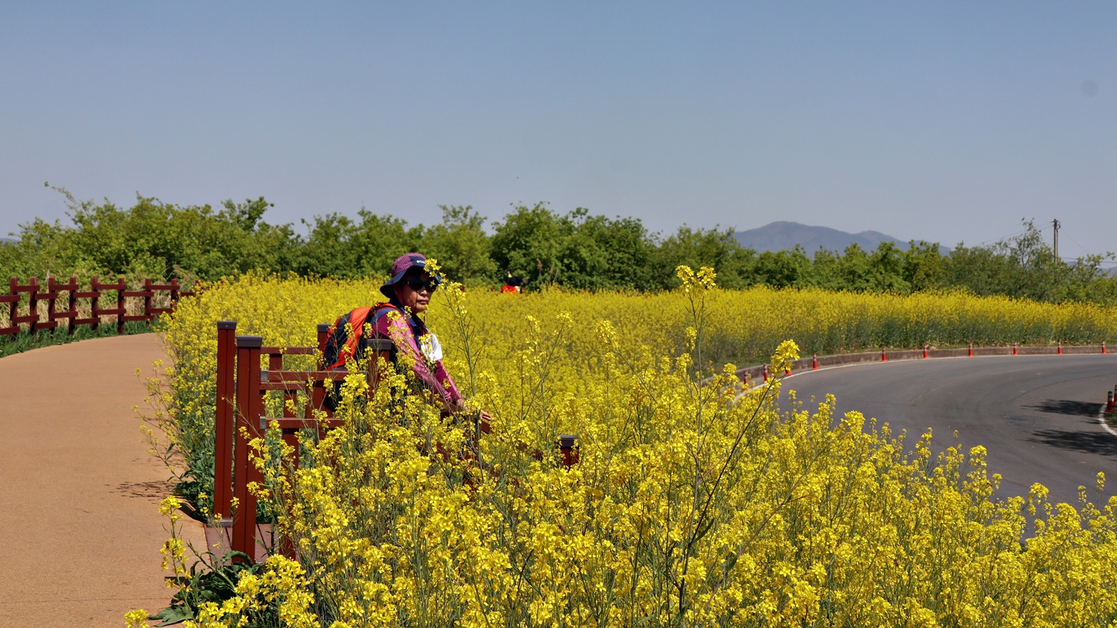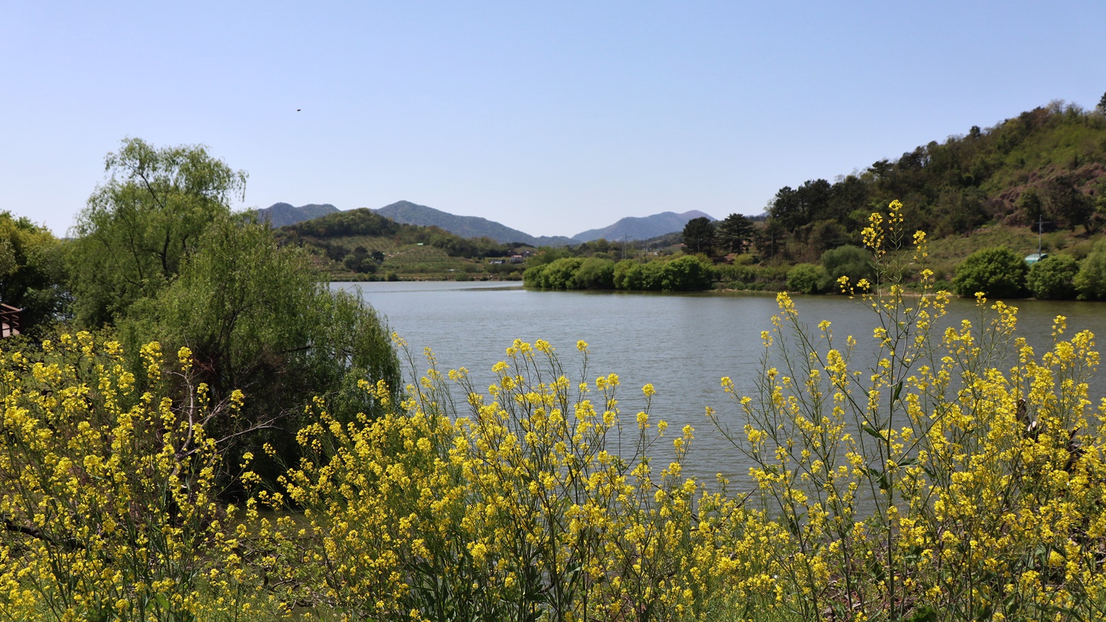 둑 길 따라 봄철 유채꽃이 피여 있습니다.