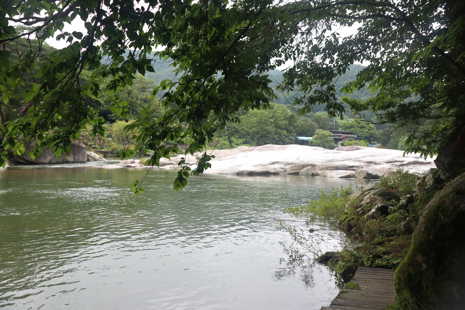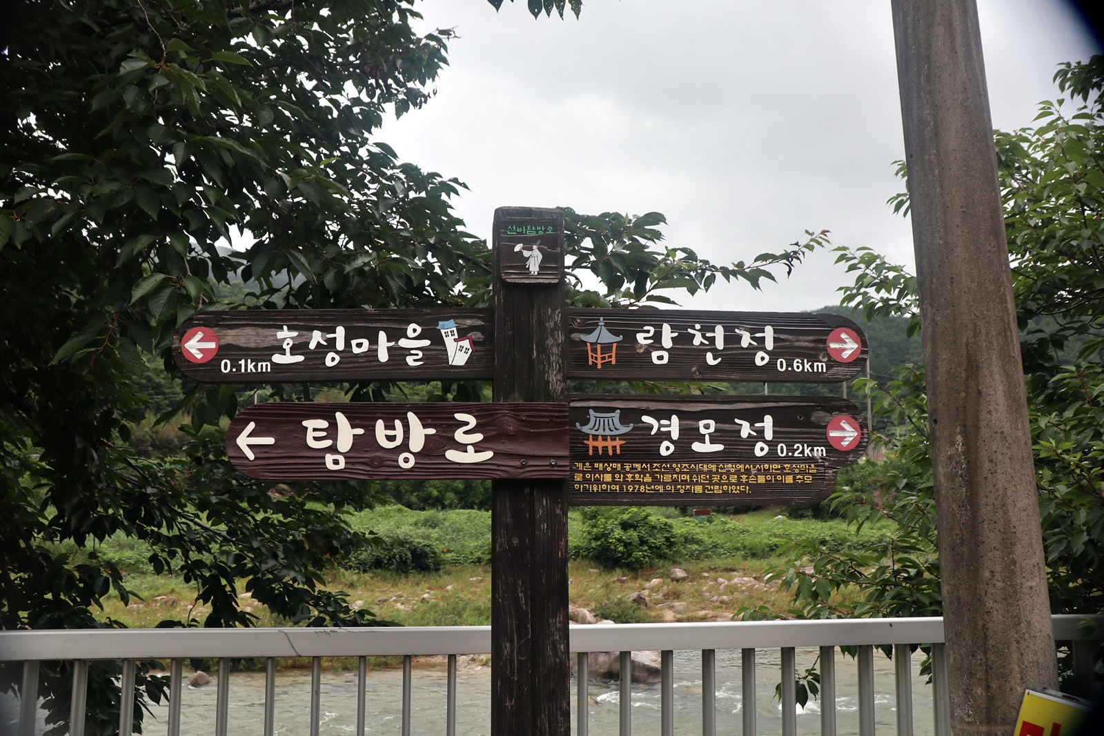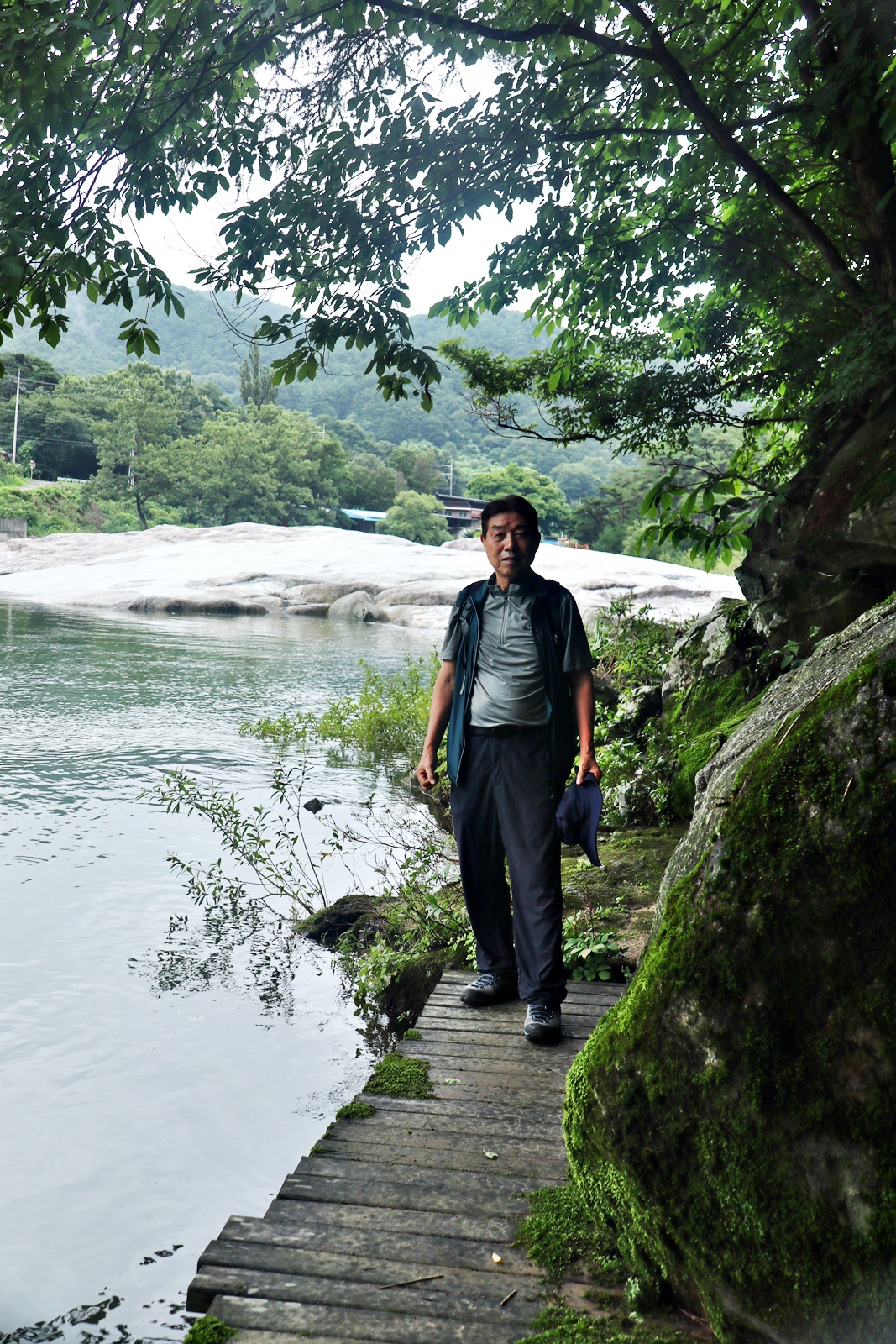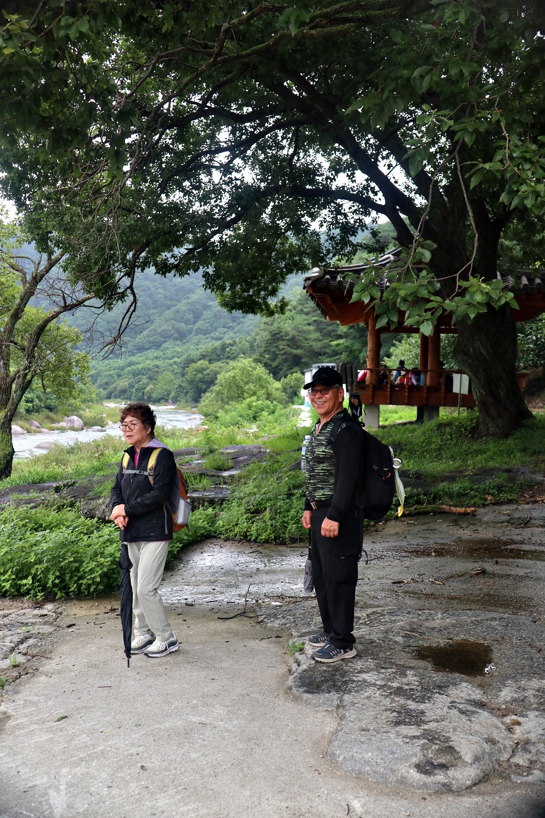 장마철이라서 계곡에 수량은 많은 편 이고 산 쪽 길은 조금 불편한 점도 있지만 전체코스 어려움은 없고 단 데크가 물기로 미끄러운 것 외는 너무 좋은 코스 입니다. 이름난 정자. 거연정 군자정 동호정 농월정 등을 지나는 코스로서 비교적 오르내림리 적은 코스에 길 입니다. 마을 앞 포장도로를 제외 하면 물길 따라가는 길이며 물에도 내려갈 수 있어 너무 좋습니다. 거연정-농월정 코스는 휴식포함 2시간이면 되는 비교적 단 코스지만 나무 그늘길이라 사계절 코스 입니다.